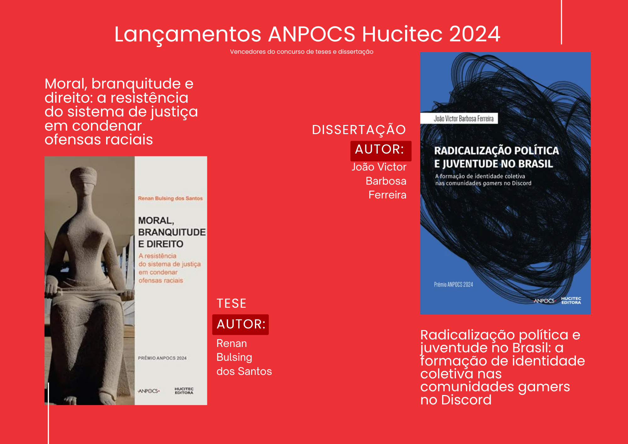 Já a dissertação “Radicalização política e juventude no Brasil: a formação de identidade coletiva nas comunidades gamers no Discord”, de João Victor Barbosa Ferreira, resulta de uma imersão etnográfica em comunidades gamers brasileiras. O autor explora como esses espaços digitais se constituem como territórios de pertencimento, disputa e formação política, acompanhando a circulação de discursos radicais e a construção de identidades coletivas entre jovens. Ao articular análise política e sensibilidade etnográfica, o livro oferece uma leitura instigante sobre as relações entre tecnologia, juventude e as novas dinâmicas da política contemporânea.